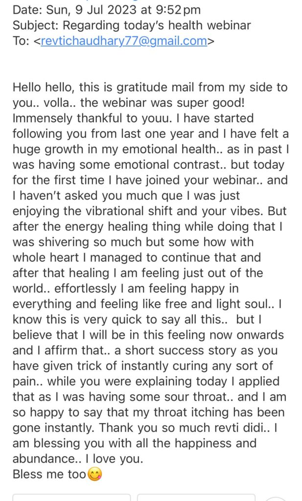 Her words say it all. That feeling of lightness wasn’t temporary. It marked the beginning of a new emotional baseline. And as if that weren’t enough, she shared an instant healing moment: her sore throat vanished during the session, just by applying the real-time technique Revti shared.