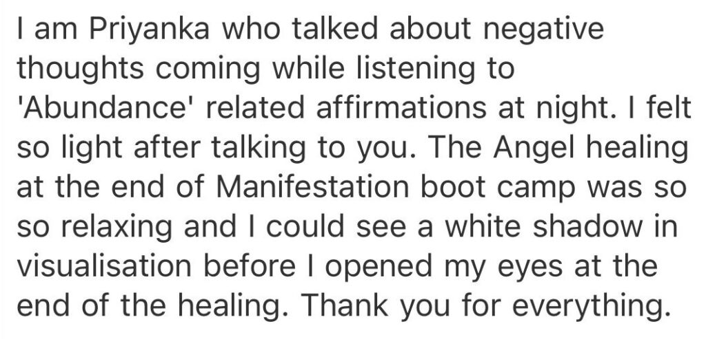In one of Revti’s Manifestation Boot Camps, Priyanka shared that she struggled with negative thoughts at night while listening to abundance affirmations. But after a conversation with Revti, she felt a noticeable sense of lightness. During the Angel Healing session at the end of the boot camp, she entered a deep meditative state.