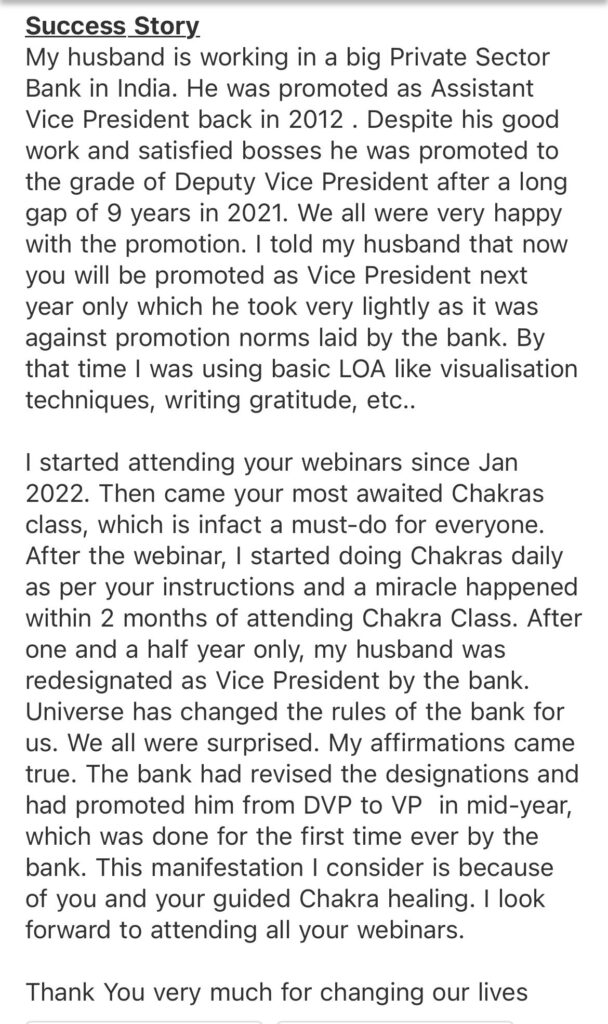 Priyanka’s journey didn’t stop there. Around the same time, she had been practicing visualisation for her husband’s professional growth. He had recently been promoted from Assistant Vice President to Deputy Vice President—after nine long years of waiting.