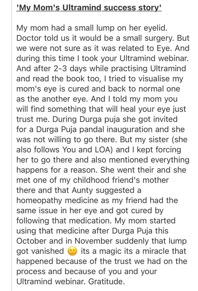 She focused her energy on visualising her mother’s complete recovery. She imagined both eyes looking perfectly normal, holding a quiet but steady belief that something would shift. She even told her mother, “You’ll find something that will heal your eye. Just trust.”