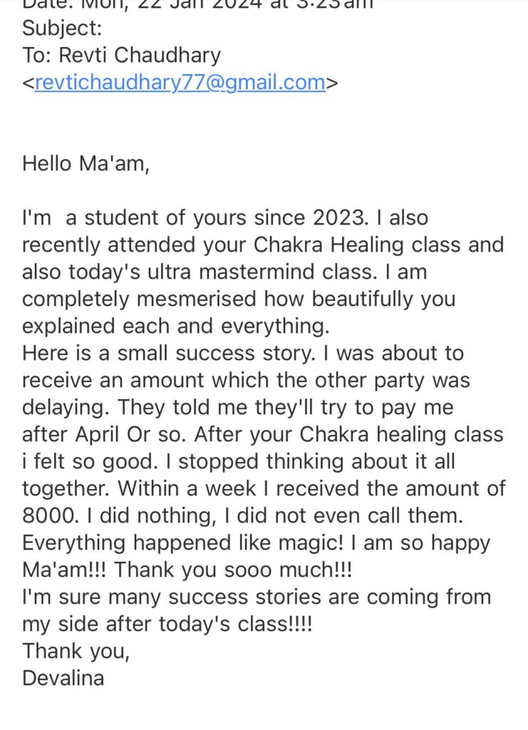 In a world where we’re taught to “chase” what we want, stories like Devalina’s prove that true power comes from alignment, not hustle. After joining Revti’s Chakra Healing and Ultra Mastermind sessions, something remarkable happened, a stuck financial payment of ₹8000 found its way back to her… without reminders, stress, or even a follow-up call. This is the magic of chakra healing in motion.